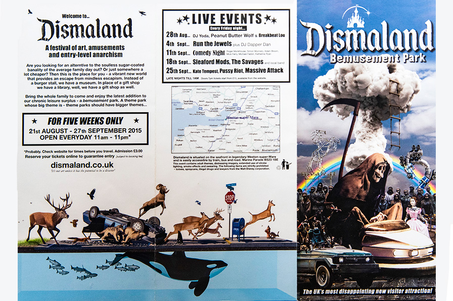 Certains éléments comme la version du château de la Belle au bois dormant sont inspirés d' œuvres de Jeff Gilette qui signera le poster officiel de Dismaland.